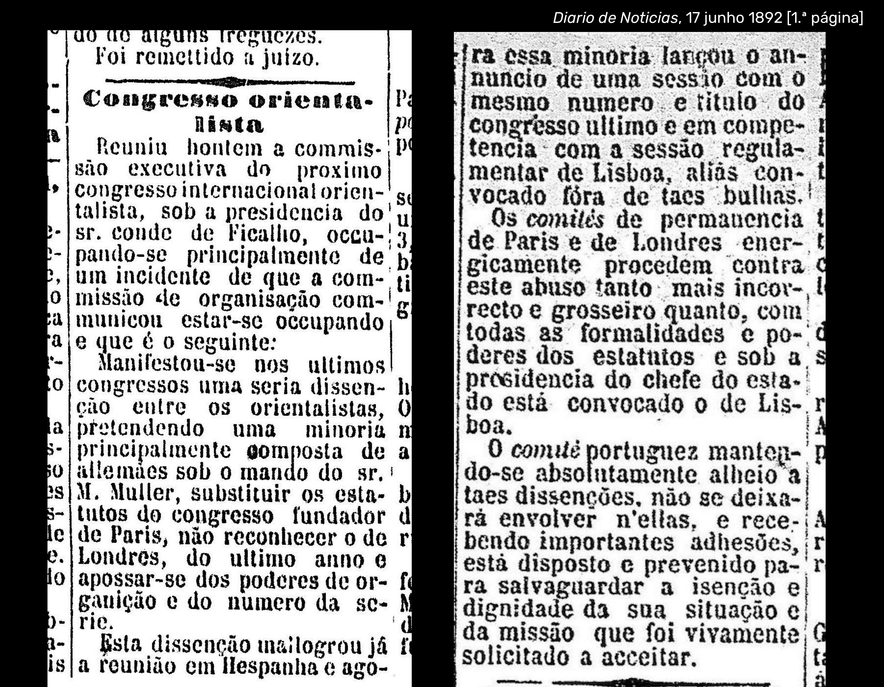 | 1 ago. | Impressão dos trabalhos para o Congresso | “Estão em impressão e annunciados muitos trabalhos interessantes para proximo congresso dos orientalistas que se realisa no fim de setembro em Lisboa.” | Diario de Noticias |