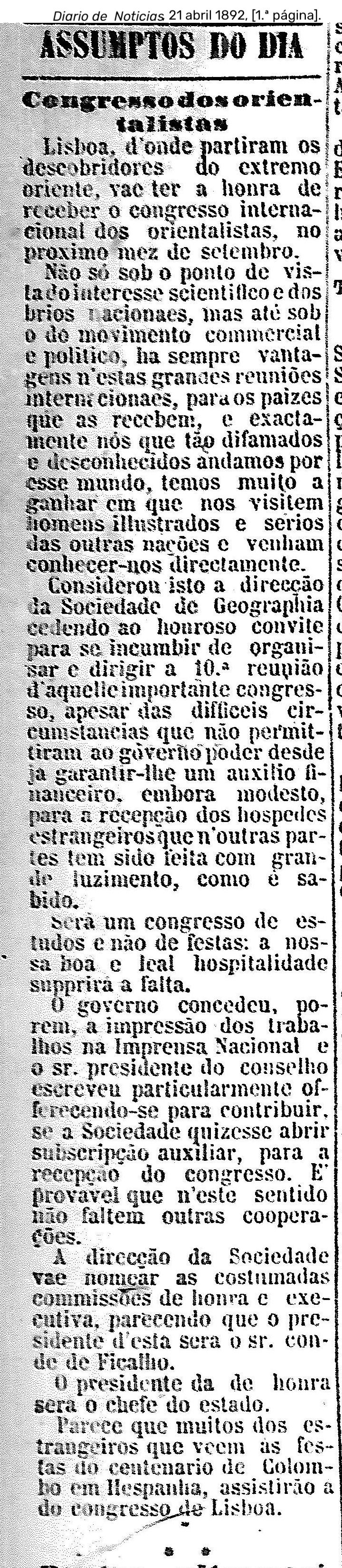 | 2 abr. | Anúncio da organização do Congresso dos Orientalistas em Portugal | “Realisar-se-ha em Lisboa a 10.ª sessão do congresso internacional de orientalistas. A Sociedade de Geographia é que está encarregada da organisação do congresso. Por essa occasião effectuar-se-a tambem uma exposição camoneana, outra de bibliographia portugueza oriental, etc.” |