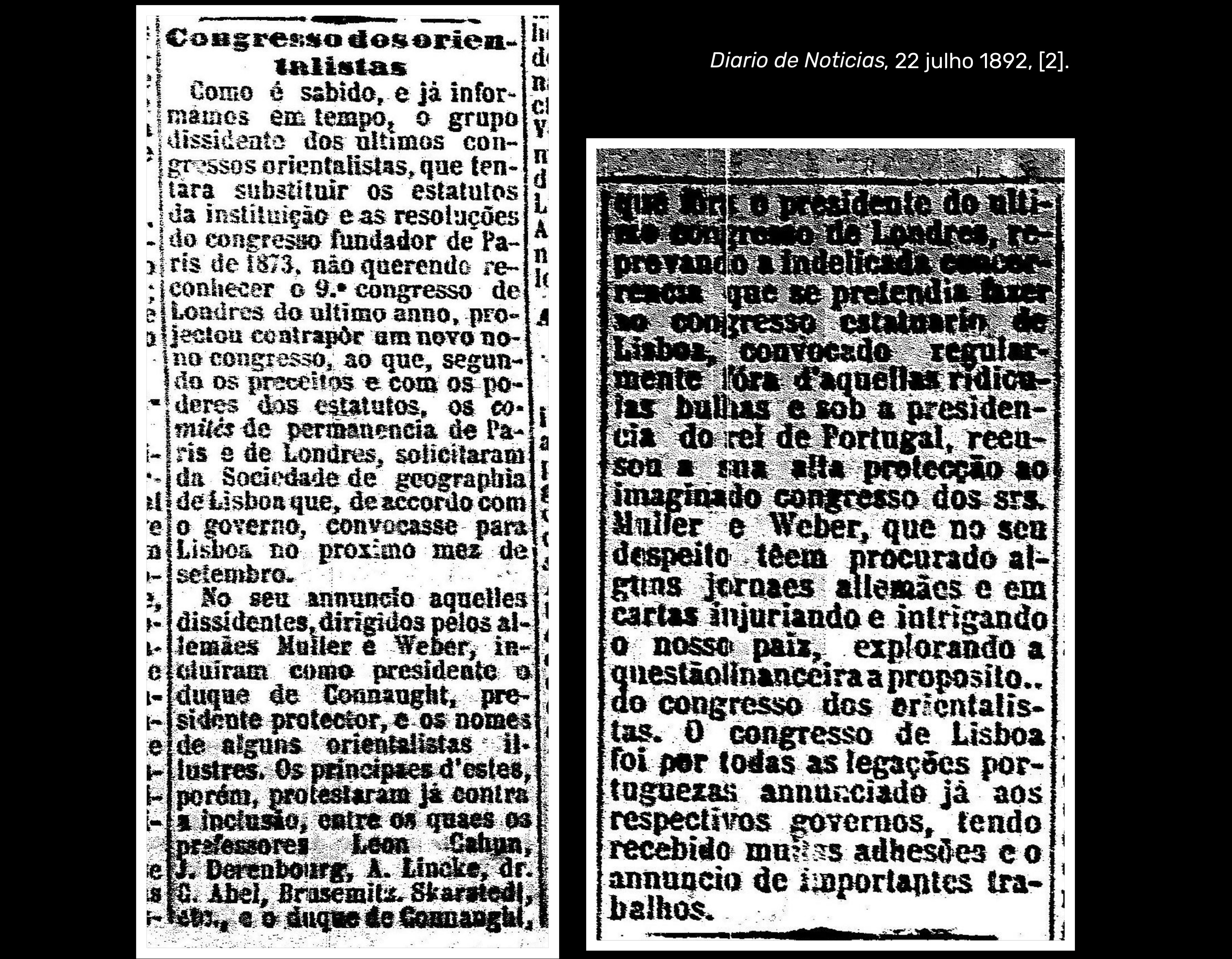 | 22 jul. | Cisma entre orientalistas | “No seu annuncio aquelles dissidentes, dirigidos pelos allemães Muller e Weber, incluiram como presidente o duque de Connaught, presidente protector, e os nomes de alguns orientalistas illustres.” | Diario de Noticias |