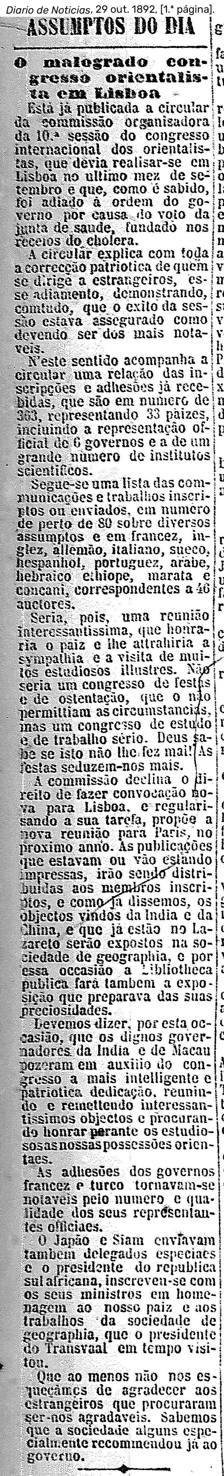 | 29 out. | Cisma entre orientalistas & cancelamento do Congresso | “O malogrado congresso orientalista em Lisboa Está já publicada a circular da commissão organisadora da 10.ª sessão do congresso internacional dos orientalistas […]. N’este sentido acompanha a circular uma relação das inscripções e adhesões já recebidas, que são em numero de 363, representando 33 paizes, incluindo a representação oficial de 6 governos […]. Segue-se uma lista das communicações e trabalhos inscriptos ou enviados, em numero de perto de 80 [...], correspondentes a 46 auctores.” |