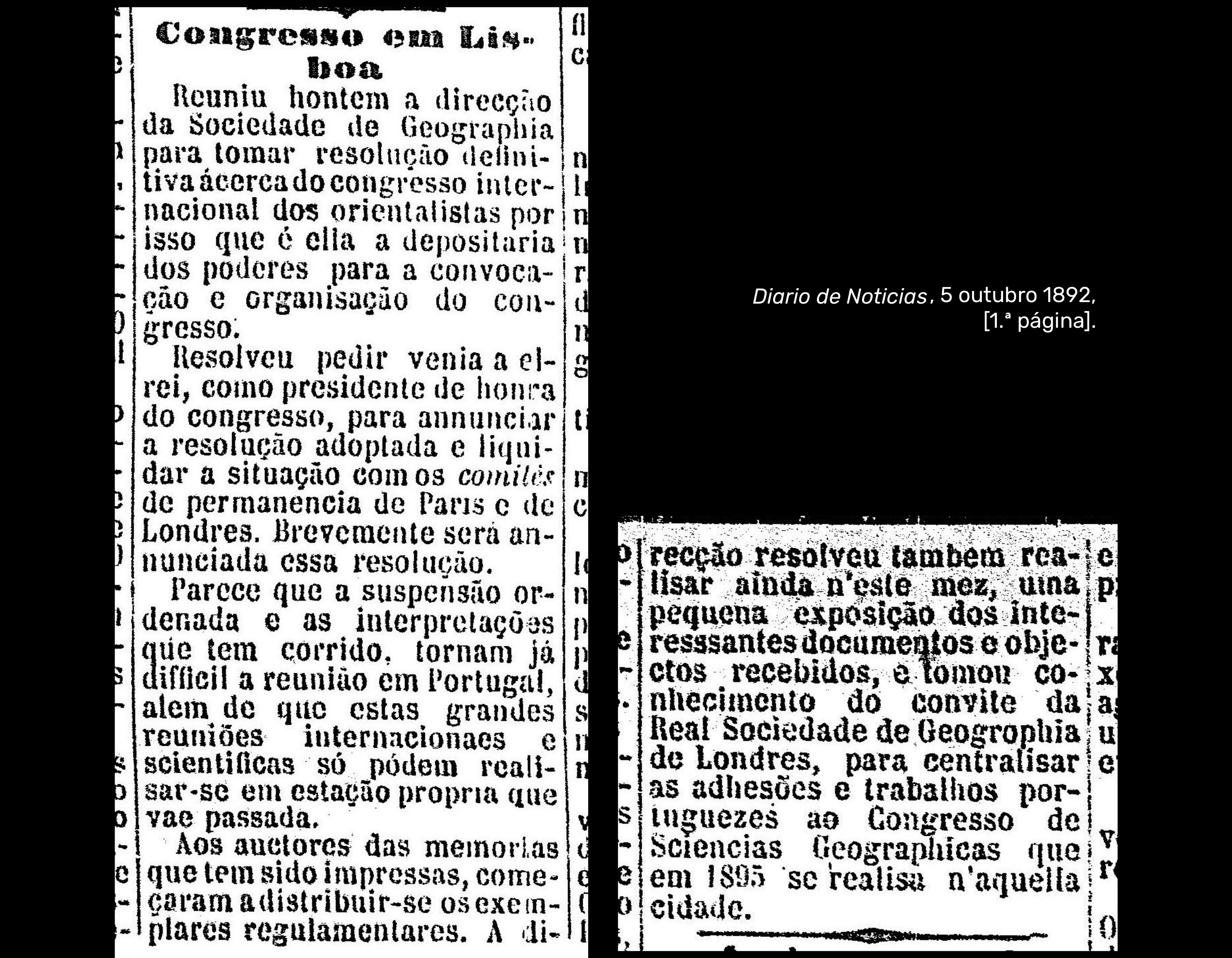 | 5 out. | Cisma entre orientalistas & cancelamento do Congresso | “Reuniu hontem a direcção da Sociedade de Geographia para tomar resolução definitiva ácera do congresso […]. Resolveu pedir venia a el-rei, como presidente de honra do congresso, para annunciar a resolução adoptada e liquidar a situação com os comités de permanencia de Paris e de Londres. [...] A direcção resolveu tambem realisar ainda n’este mez, uma pequena exposição dos interessantes documentos e objectos recebidos, e tomou conhecimento do convite da Real Sociedade de Geographia de Londres, para centralisar as adhesões e trabalhos portuguezes ao Congresso de Sciencias Geographicas que em 1895 se realisa n’aquella cidade.” |