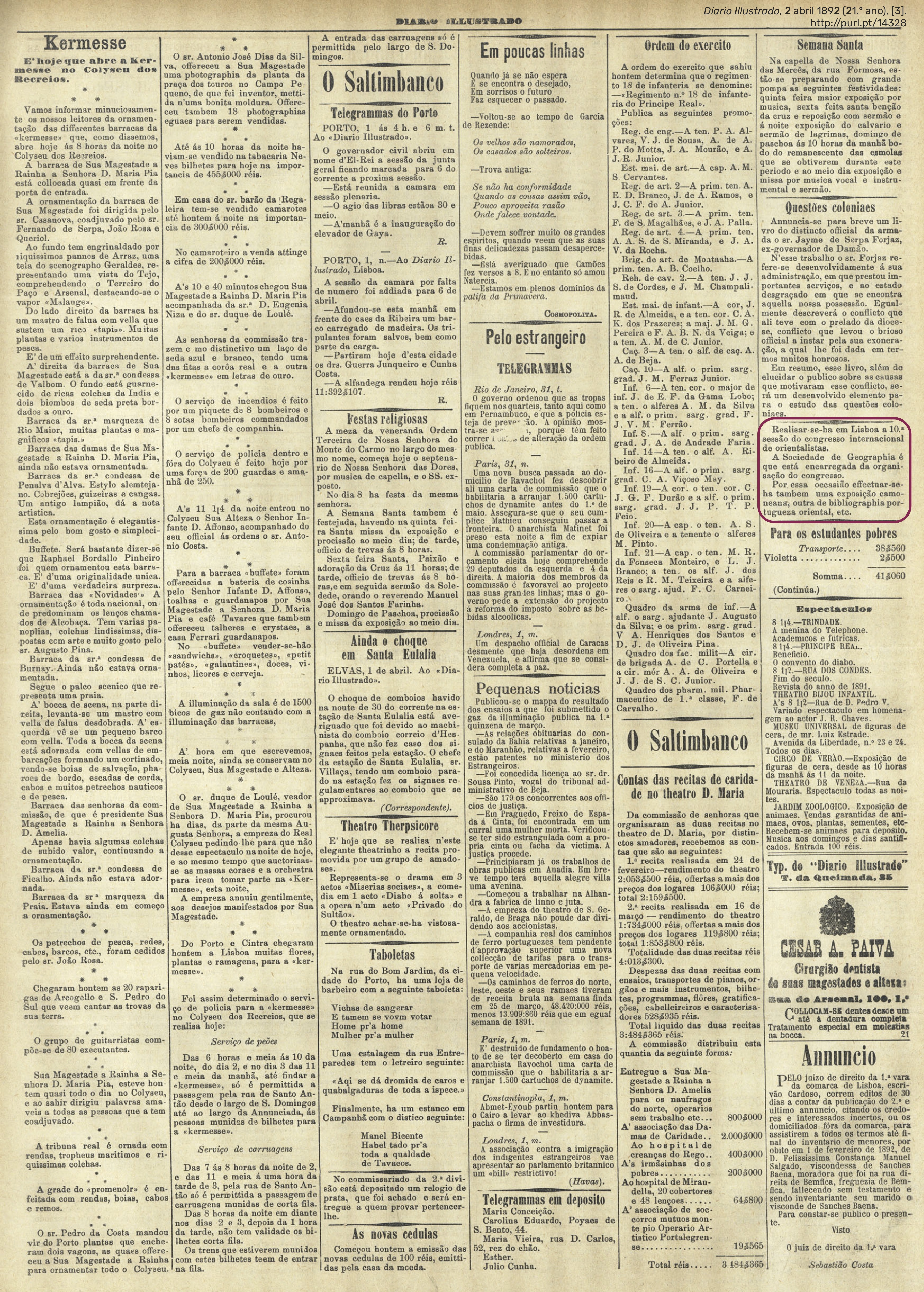 | 3 jun. | Descontos | “As pessoas que se destinam ao congresso internacional dos Orientalistas que se effectuará brevemente em Lisboa, gosam de abatimentode 500,0 no preço das suas passagens, nas linhas ferreas da companhia real portuguesa.” | Diario Illustrado |